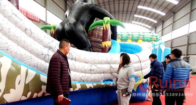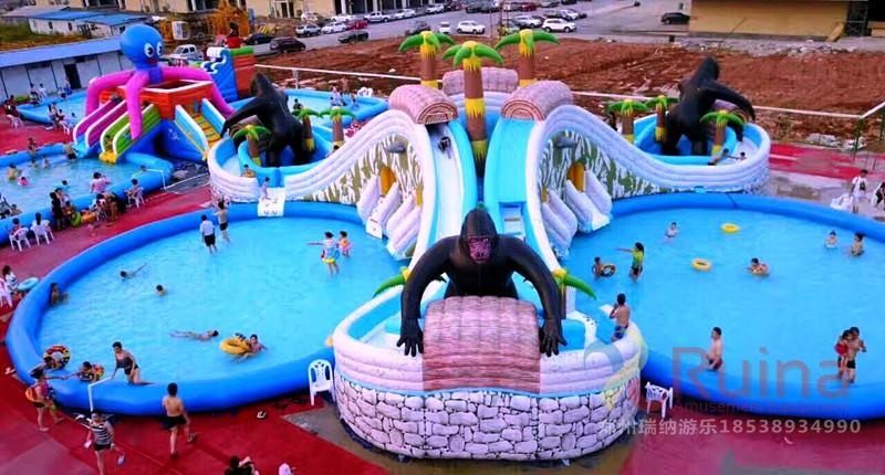 以猩猩林中搬運(yùn)物品嬉戲?yàn)橹黝},人在林中穿梭,從而達(dá)到人景合一的境界;在設(shè)計(jì)結(jié)構(gòu)上是以三個對稱的滑梯組成,加上噴水的效果,給人以視覺上對稱的美感!每個滑梯下面都配有一個充氣水池,水池中放些水上浮具,如香蕉船、水狗、冰山等,讓移動水上樂園的玩法更加豐富。