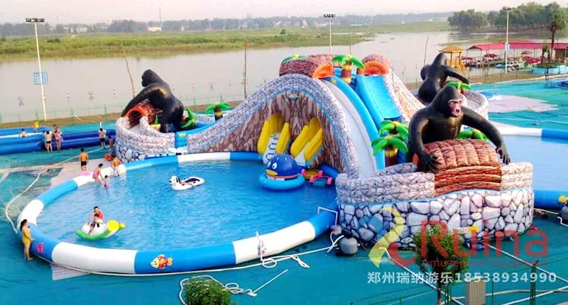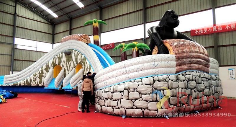 樂園中的三個黑色大猩猩造型被設(shè)計(jì)的異常逼真,讓游客忍不住會有前去和它合影留念的想法。滑梯的顏色則采用了和大山、巖石一樣的顏色,搭配及其合理,把花果山的造型形象的表述了出來,亦幻亦真,擁有如此優(yōu)美意境的一款全新移動水上樂園,相信將會給周圍游玩的人群帶來一種怦然心動的感覺,讓他們會產(chǎn)生一種前去游玩一番的沖動!