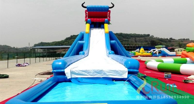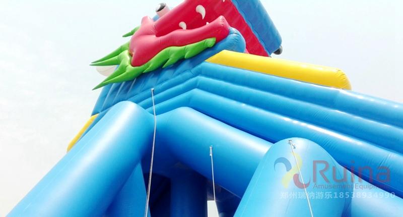充氣水滑梯造型變化多端、游樂趣味濃烈、驚險刺激而不失安全,深受兒童喜愛。