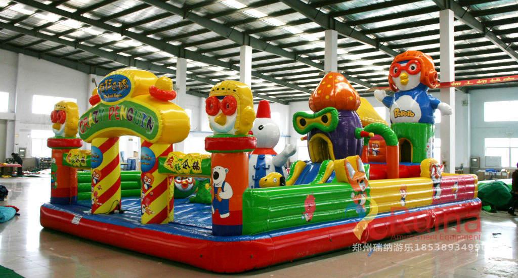 該款企鵝充氣城堡制作過程采用了下料、縫紉、熱合、粘整等工藝,適用于學(xué)校,娛樂城、游樂園、超市、大型商場等兒童聚集地。企鵝造型異常逼真,栩栩如生,能夠強烈吸引著孩子們前去玩耍。這款城堡玩法豐富,可以滑、蹦、鉆、跳等,娛樂無窮。